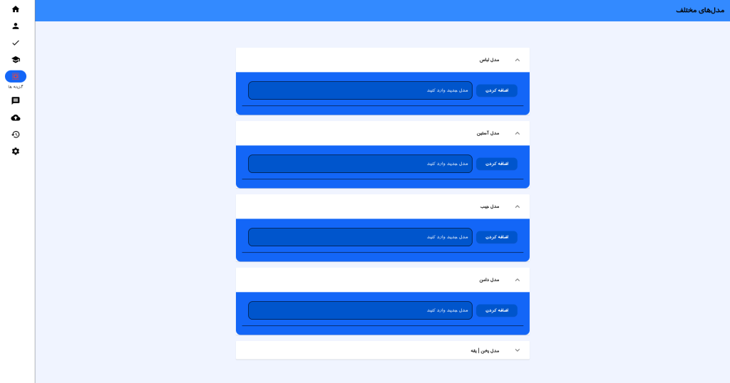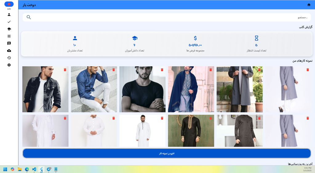 قابلیت ثبت و مدیریت نمونه‌های لباس به‌عنوان یک مرجع بصری و اطلاعاتی برای سفارش‌های بعدی.